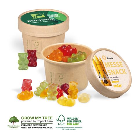 Premium Fruchtgummi individuell verpackt! Leckere Premium Fruchtgummi-Bärchen mit Fruchtsaftgehalt durch Fruchtsaftkonzentrat, gluten- und laktosefrei. Einfach köstlich und mit besten Zutaten. Geschmacksrichtungen: Apfel, Zitrone, Orange, Himbeere, Ananas, schw. Johannisbeere. Im wiederverschließbaren Kartonbecher mit Frischesiegel und individuellem Einleger im Deckel.. Produktdetails: Premium Fruchtgummi im Kartonbecher (FSC®-zertifiziert) mit individuellem Werbe-Einleger im Deckel.. Nachhaltigkeit: Für jede Bestellung mit uns wird ein Baum über GROW MY TREE gepflanzt. Wir verwenden FSC® zertifizierten Karton aus nachhaltiger Forstwirtschaft und anderen kontrollierten Quellen.Beliebte Produkte aus der Kategorie Lebensmittel